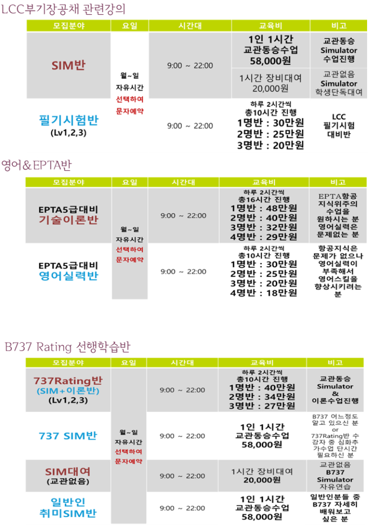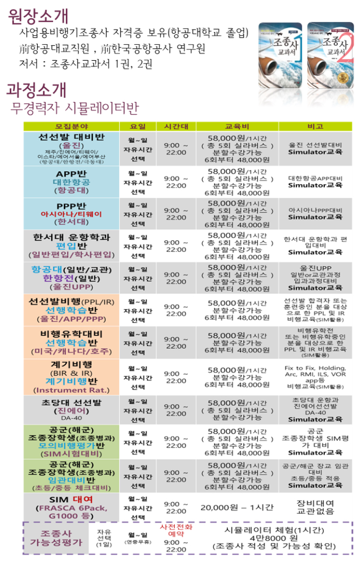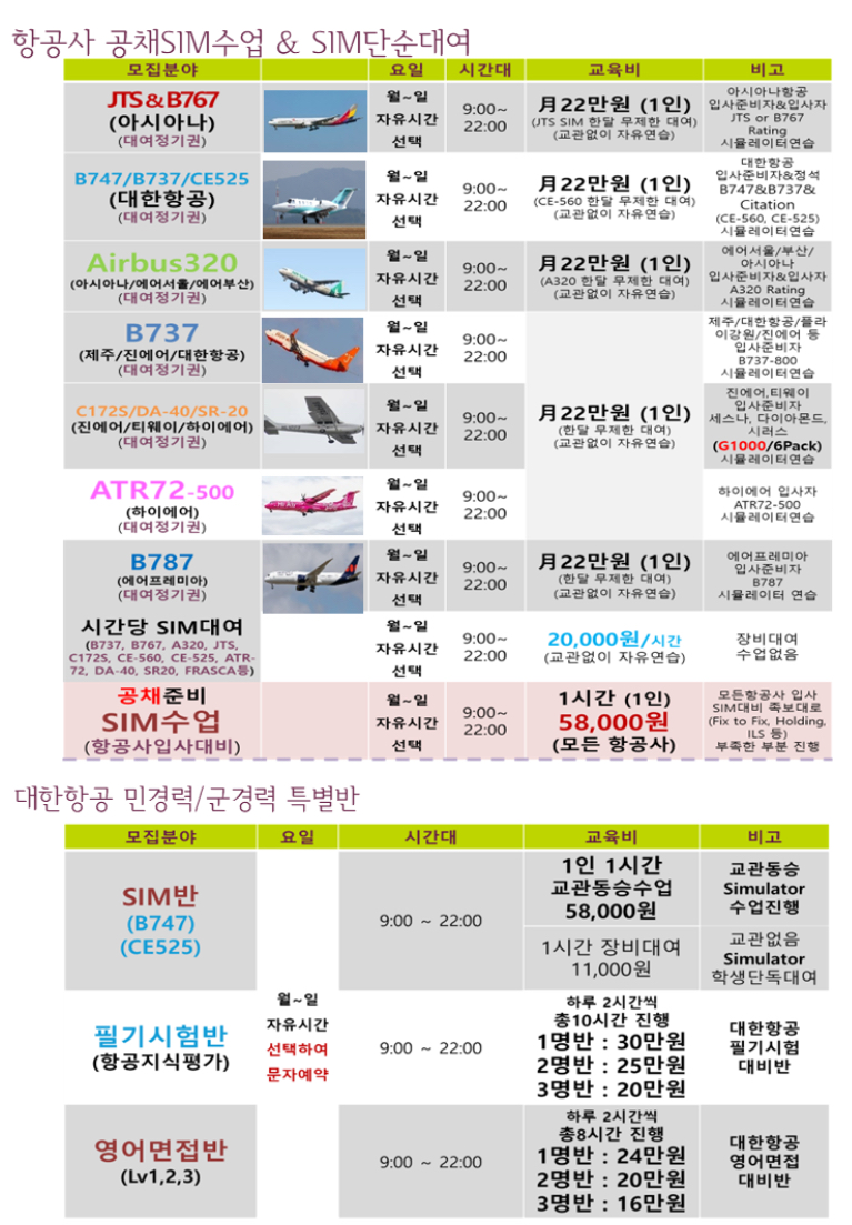 2. 비행적성(시뮬레이터) : 교대역조종사학원에서 무경력자 시뮬레이터반 선선발대비반(일반과정인경우 항공대일반or교관/한항전일반반) 수강하기(아래그림참조)