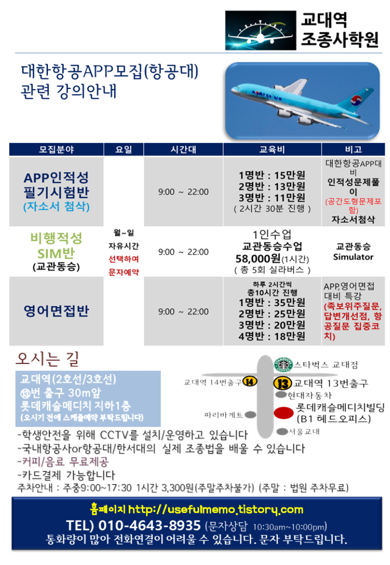 1. 인적성 시험(필기시험) : 교대역조종사학원에서 무경력자지상학 대한항공APP반 수강하기 (아래 그림 참조)