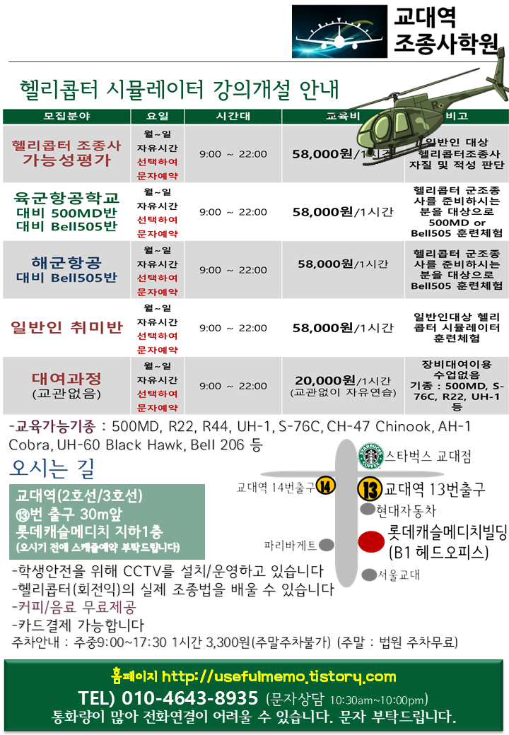 교대역조종사학원/헬리콥터(회전익) 시뮬레이터 강의 헬리콥터 조종사 시뮬레이터 과정 신설안내(회전익과정) - 헬리콥터 배울 수 있는 곳 by 하늘이_ 2020. 9. 25. 안녕하세요.교대역조종사학원입니다아래와 같이 헬리콥터 조종을 배워볼 수 있는시뮬레이터 과정을 신설하였습니다회전익(헬리콥터) 관심 많으신 분들 참고 부탁드립니다 공유하기 게시글 관리 조종사 교과서 (교대역조종사학원) 저작자표시 동일조건 (새창열림)