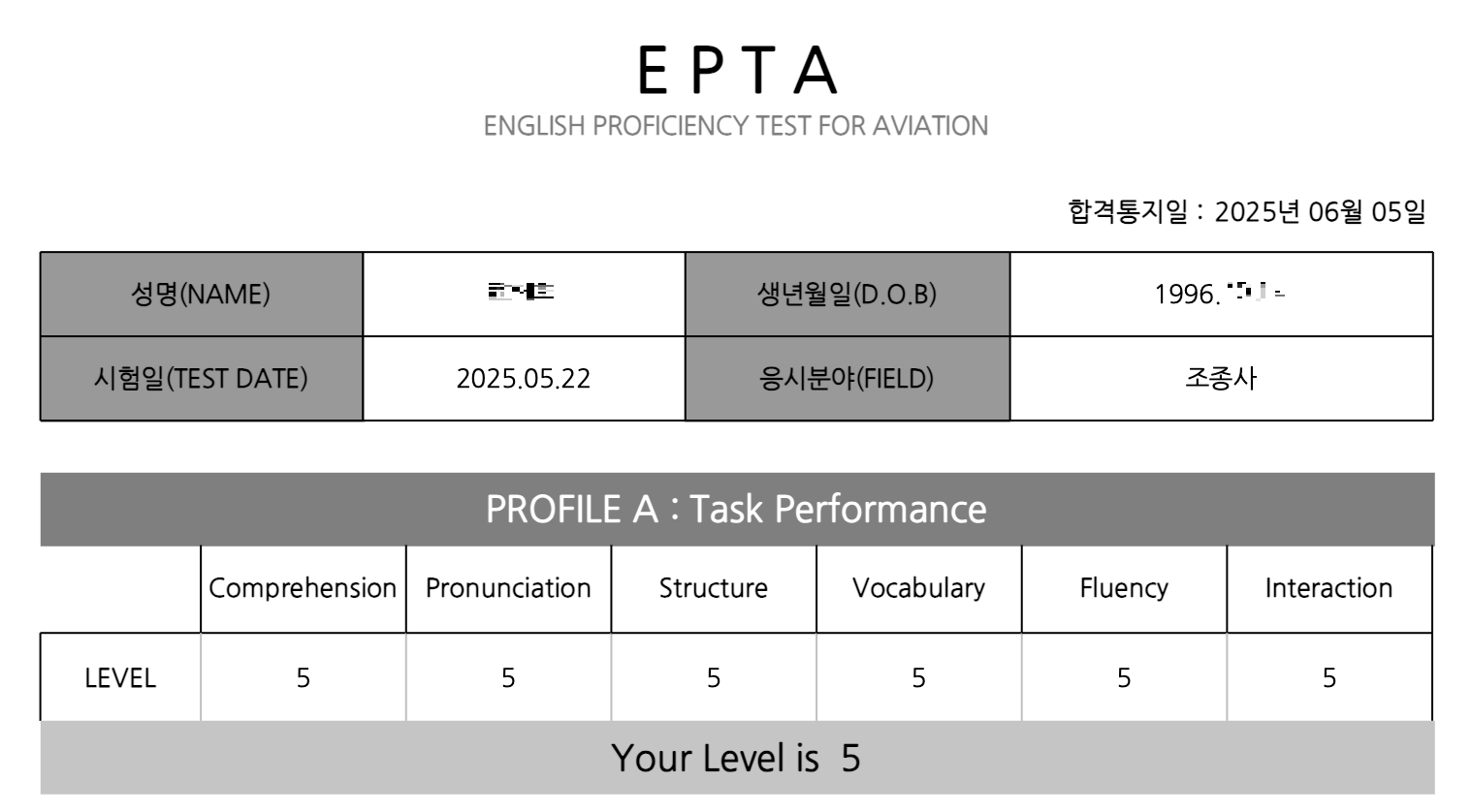 EPTA5급을 취득하셨습니다